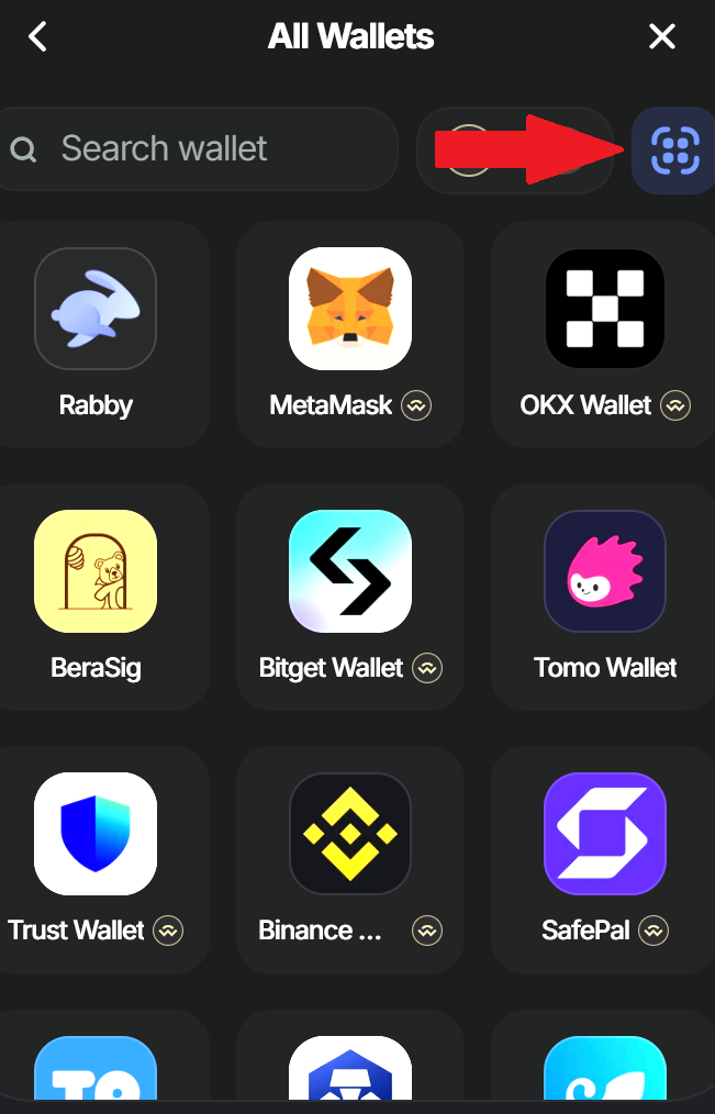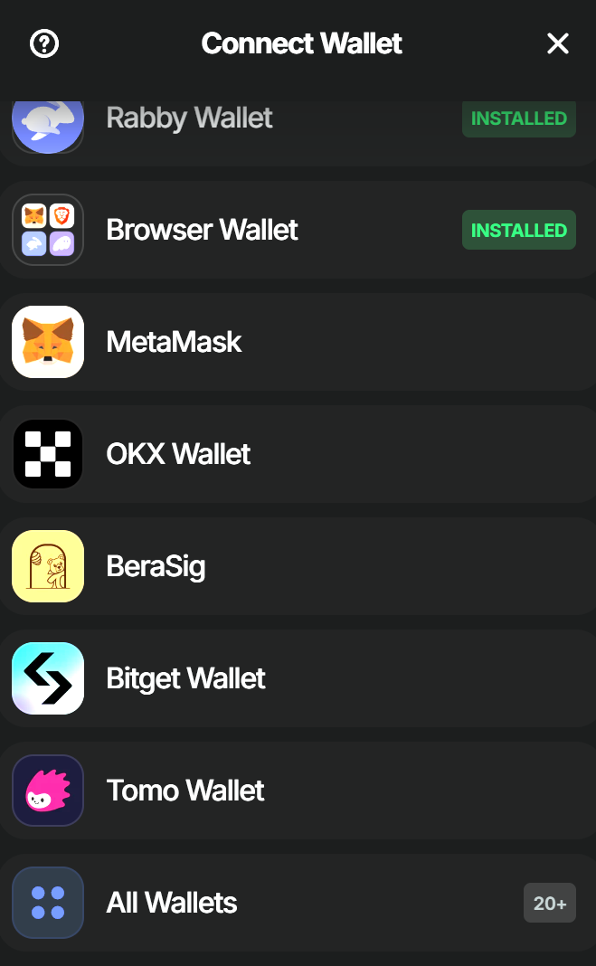 Note: If Wallet Connect does not appear in the Connect Wallet menu, click "All Wallets", then locate and select Wallet Connect. Each platform has a different UI. We are using Kodiak as an example.