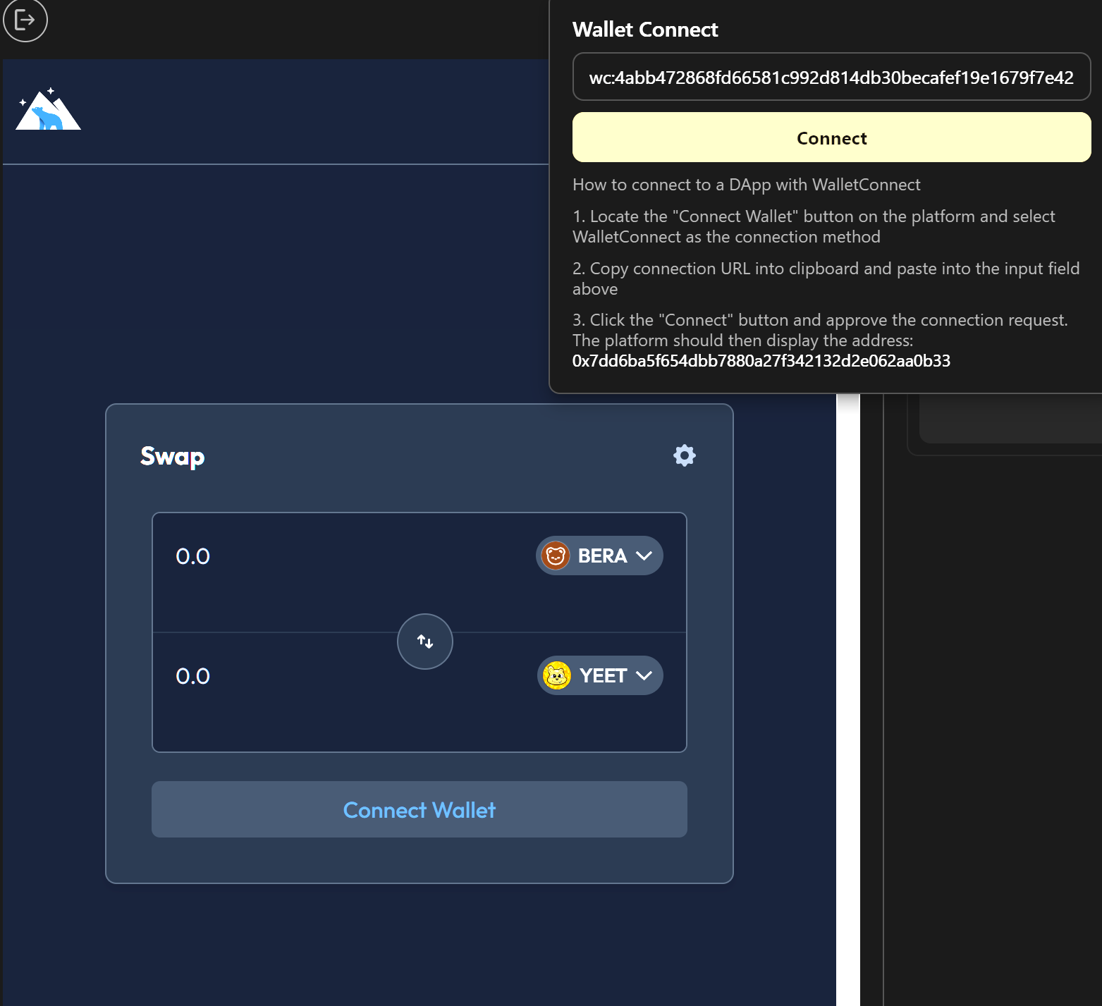 Go back and paste the copied URL to the Wallet Connect button at the top right corner