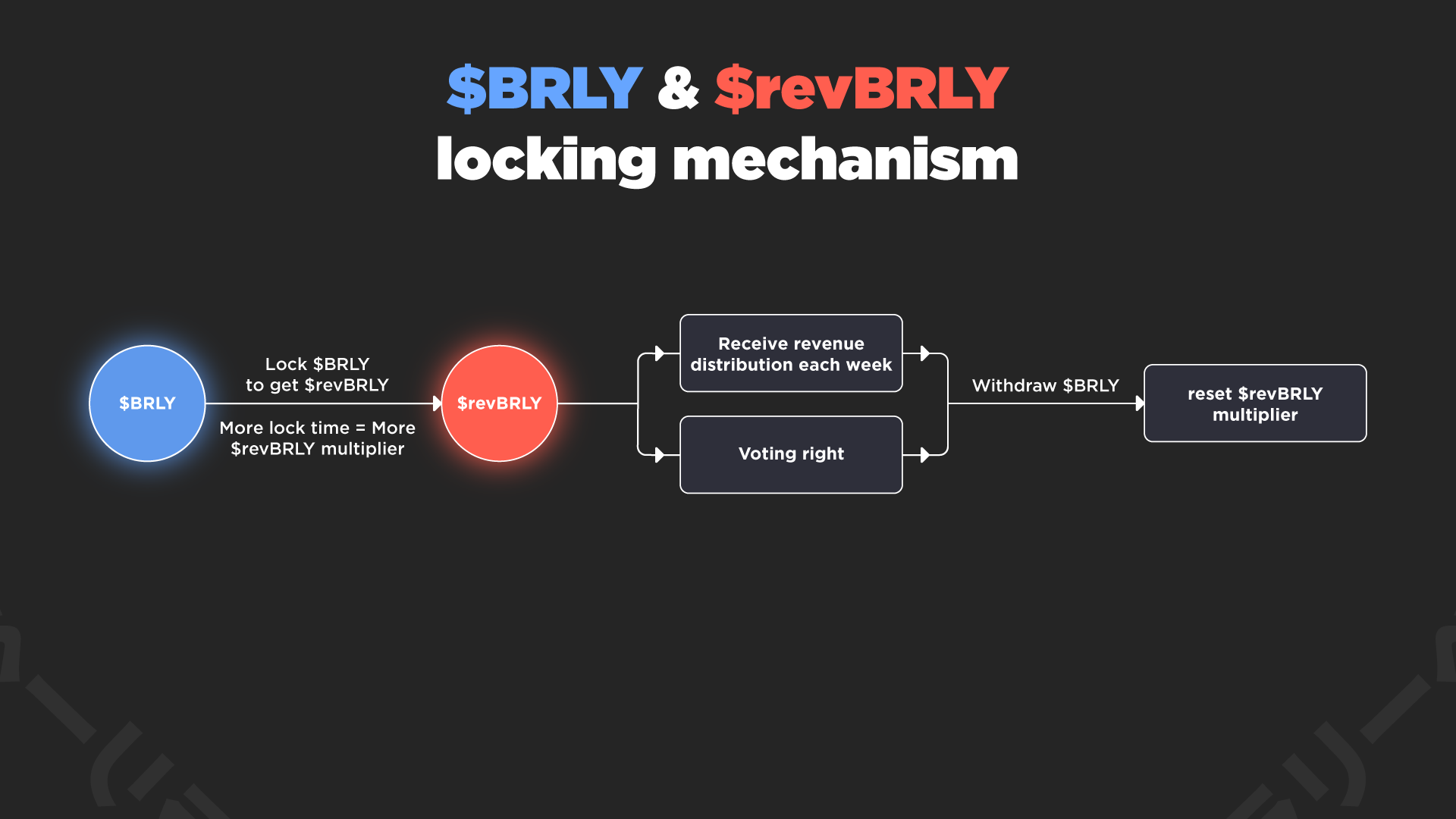 **Acquisition of $revBRLY:** Users can obtain $revBRLY token score by locking their $BRLY. The amount of $revBRLY awarded depends on the locked duration, with longer locks generate higher amounts. This system incentivizes users to commit their $BRLY tokens for extended periods, thereby stabilizing the token supply and supporting the platform's long-term growth.